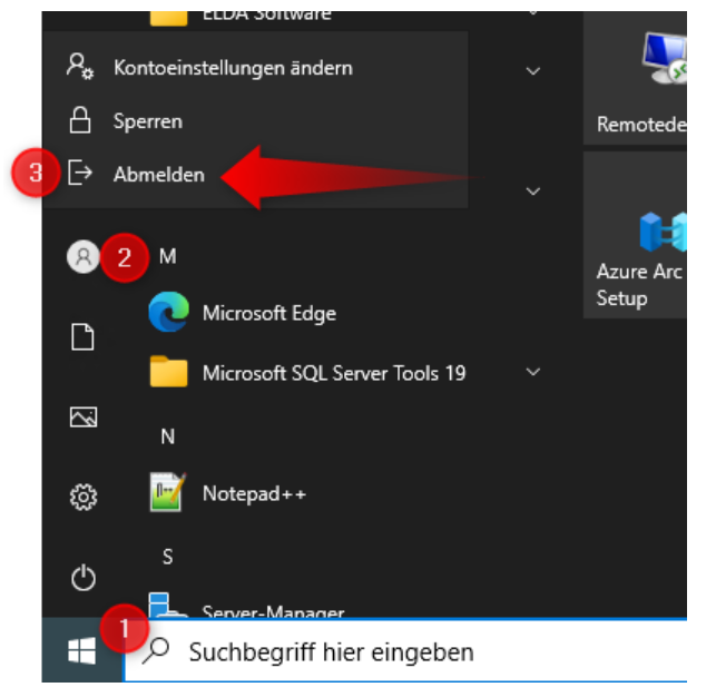Richtig: Gehe auf Start -> Abmelden (oder das Symbol „Abmelden“ auf dem Desktop).